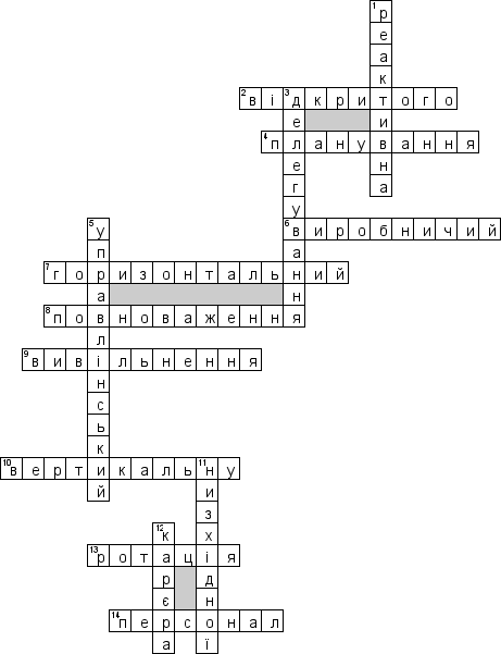 ![]() Кроссворд по предмету "предмету Управління персоналом (укр.)" на тему "Рух персоналу (укр.)" ![]() По горизонтали 2. За ступенем відкритості кадрової політики до зовнішнього середовища розрізняють кадрову політику … та закритого типу 4. Процес визначення кількісної та якісної потреби в персоналі 6. Персонал, діяльність якого безпосередньо повязана зі зміною якостей предметів праці 7. Тип карєри, що припускає кваліфікаційне просування працівника впритул до його характеристики як професіонала у своїй справі 8. Право використовувати ресурси організації задля досягнення поставлених перед нею цілей 9. Напрямок управлінської діяльності, який спрямовується на скорочення чисельності працівників 10. Трудову карєру поділяють на горизонтальну та … 13. Система переміщення працівника всередині підрозділу або організації на нові робочі місця на регулярній та планомірній основі 14. Особовий склад організації, який включає працюючих власників і співвласників По вертикали 1. Продовжіть ряд: активна, пасивна, превентивна… кадрова політика 3. Передача частини прав і обовязків керівником підлеглому, який приймає на себе відповідальність за виконання певного спектру робіт 5. Крім виробничого, є … персонал 11. Перехід керівника на посаду фахівця, яка вимагає більш низького рівня кваліфікації, є прикладом … карєри 12. Індивідуальна послідовність змін у статусі та складності праці особистості |